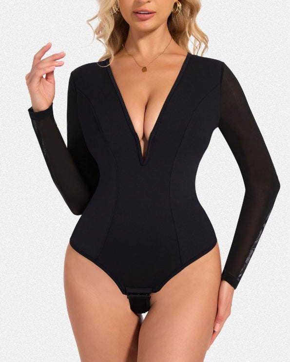 V-Neck Mesh Long-Sleeved Shapewear Thong Bodysuit
