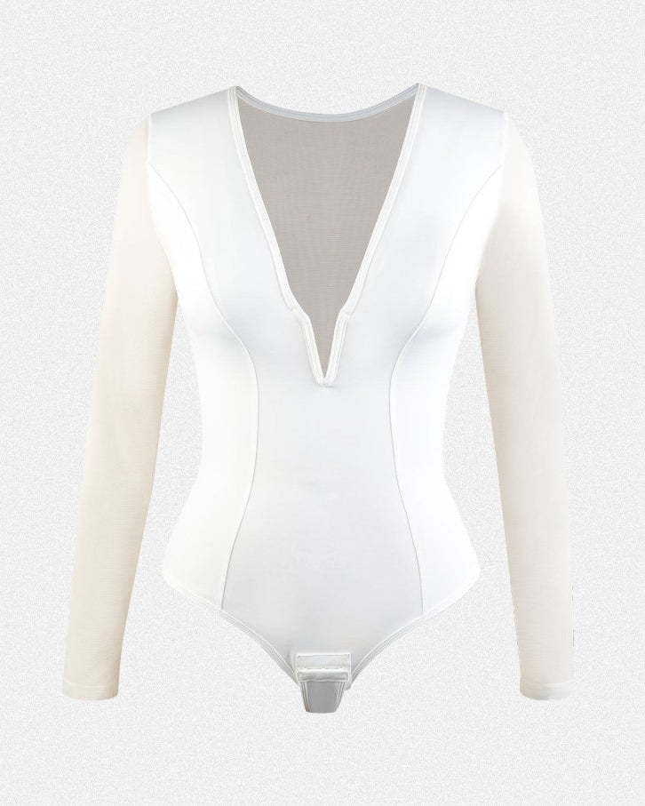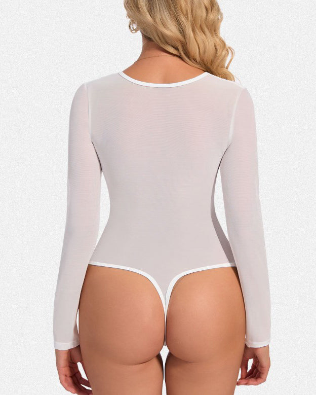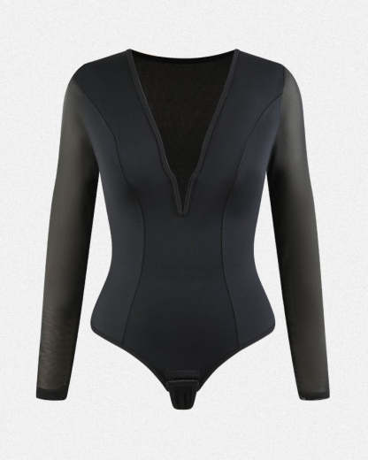 V-Neck Mesh Long-Sleeved Shapewear Thong Bodysuit